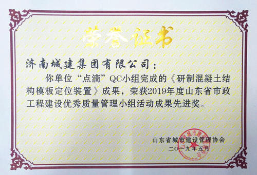 集团“点滴”QC小组完成的《研制混凝土结构模板定位装置》效果荣获“2019年度山东省市政工程建设优异质量治理小组运动效果先进奖